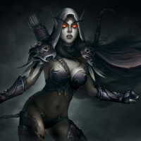 The image depicts a fantasy character, which seems to be a female drow (dark elf). She is wearing armor and is holding a bow. Her expression is intense and focused. The background has a dark and eerie atmosphere, with lightning bolts and smoke. This character is likely from the Dungeons & Dragons fantasy role-playing game.