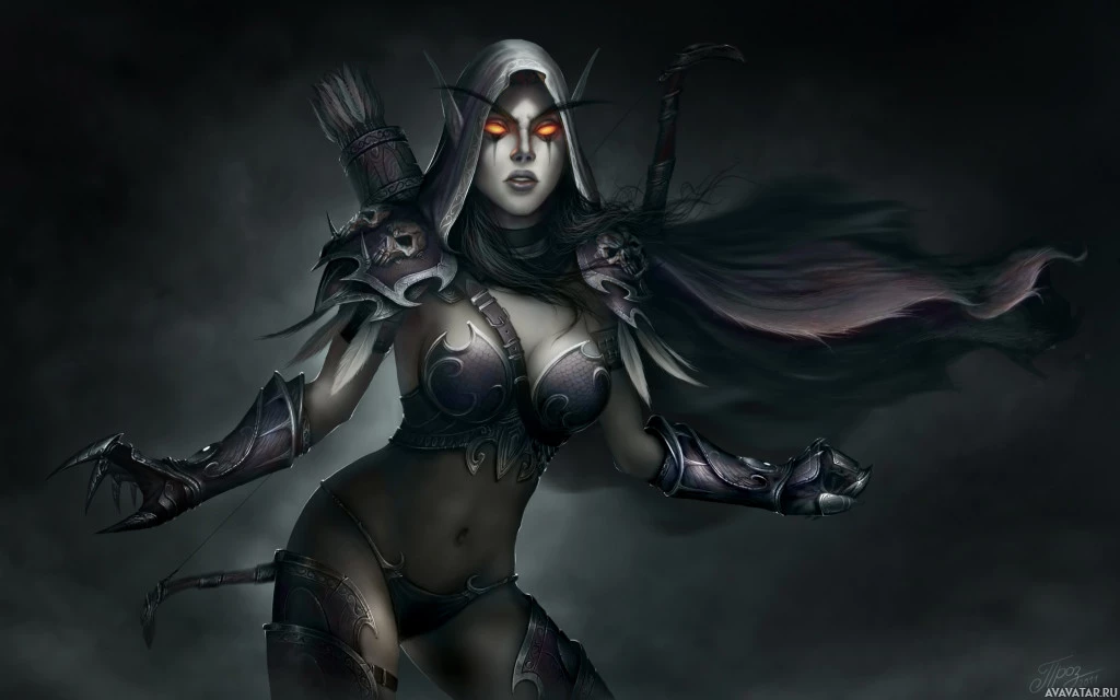 На картинке изображен фэнтезийный персонаж, который кажется самкой дрона (темный эльф). Она носит доспехи и держит лук. Ее выражение интенсивное и сосредоточенное. Фон имеет темную и жуткую атмосферу, с молниями и дымом. Этот персонаж, вероятно, из фэнтезийной ролевой игры Dungeons & Dragons.