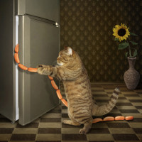 На картинке изображена кошка с лапами внутри открытого холодильника, держась за хот-доги и отрывая их от стаи. Обстановка выглядит как кухня или комната с винтажной темой дизайна.