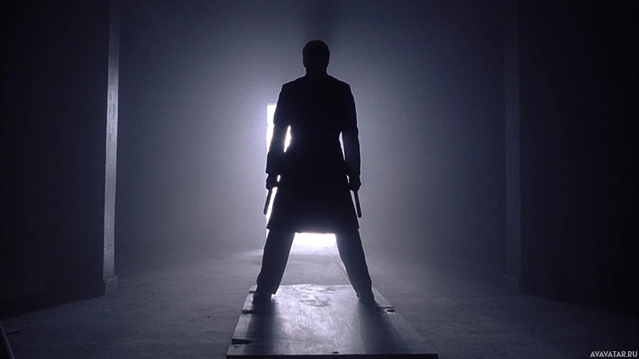 a film scene from "Equilibrium," which is known for its visually striking and dramatic use of silhouette effects.