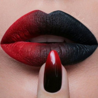 The picture shows a person's face with makeup. The individual has dramatic lipstick that is split into two halves, one red and the other black, which creates
