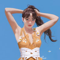 a bathing suit or swimwear, suggesting the setting might be near water or it could be summer attire. She has her hand raised slightly above her head, as if she's waving or gesturing. There is also a slight breeze indicated by some