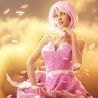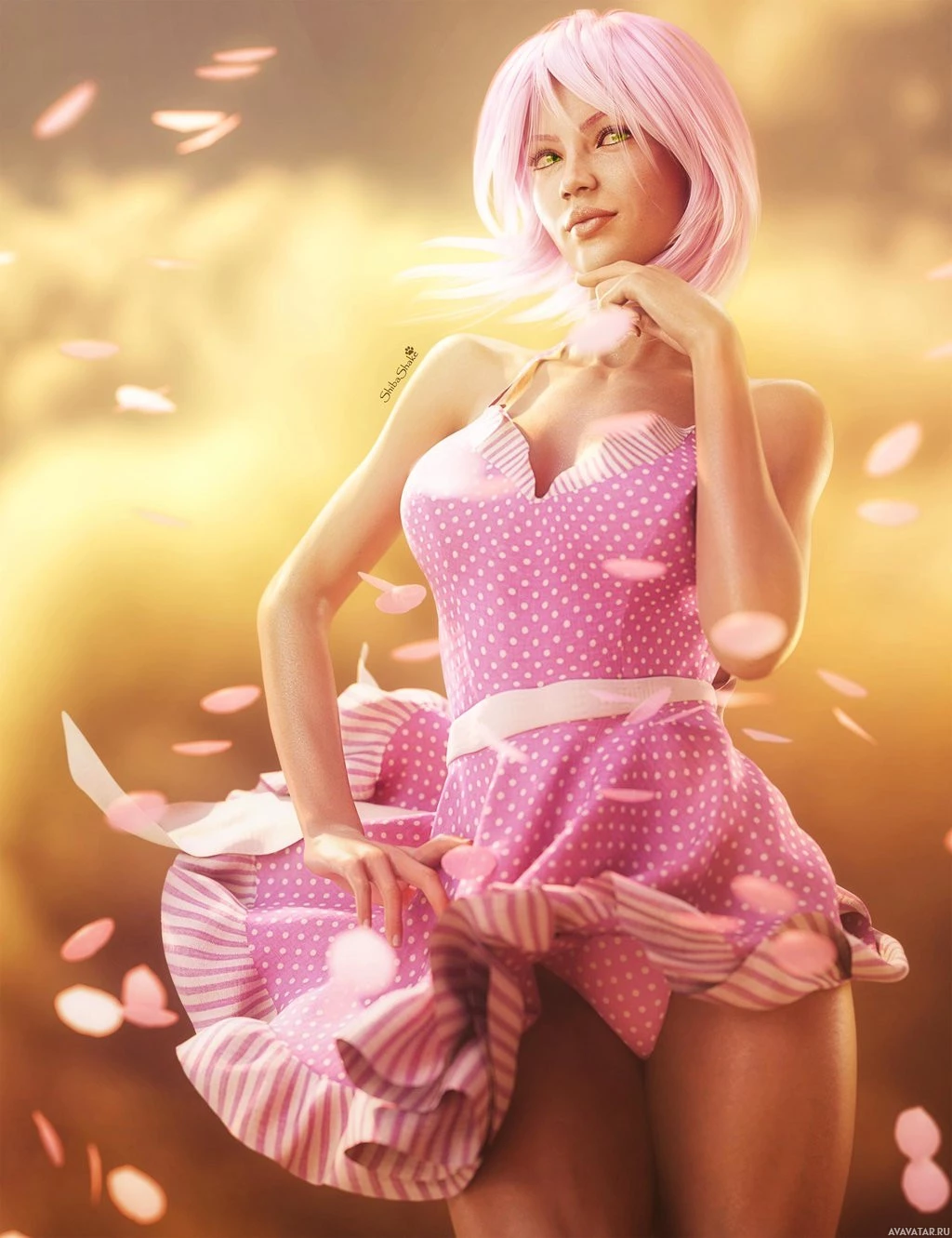 female character with pink hair. She is dressed in a colorful, polka-dot outfit that appears to be inspired by retro or