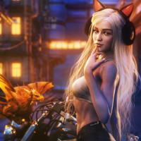 Daenerys Targaryen. She is depicted as wearing headphones and has cat-like ears on her head. In the background, there's a motorcycle which adds to the urban or adventurous theme of the image. The style of the image suggests it could be from
