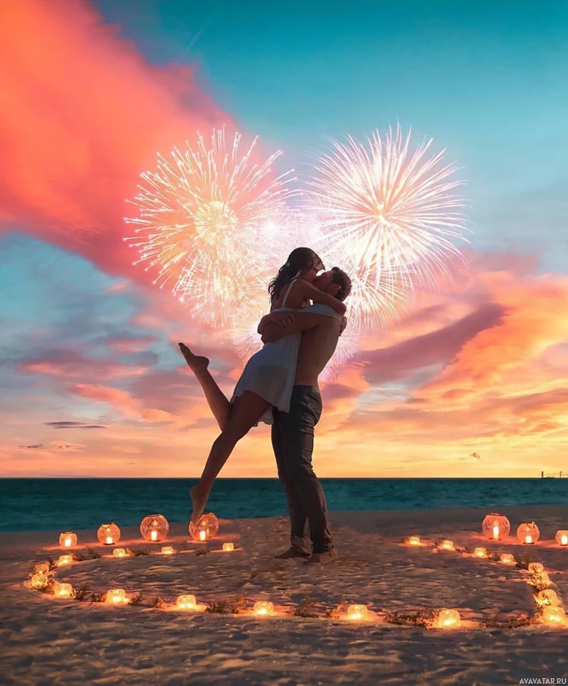 a heart shape on the sand around them, adding to the romantic atmosphere of the scene.