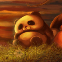warm hues across the sky. The panda is sitting on what seems to be a bed of straw or grass, and there are some apples scattered around, suggesting it might be