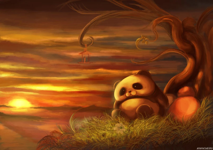 a panda bear. The setting appears to be a peaceful autumn scene, with the sun setting in the background, casting