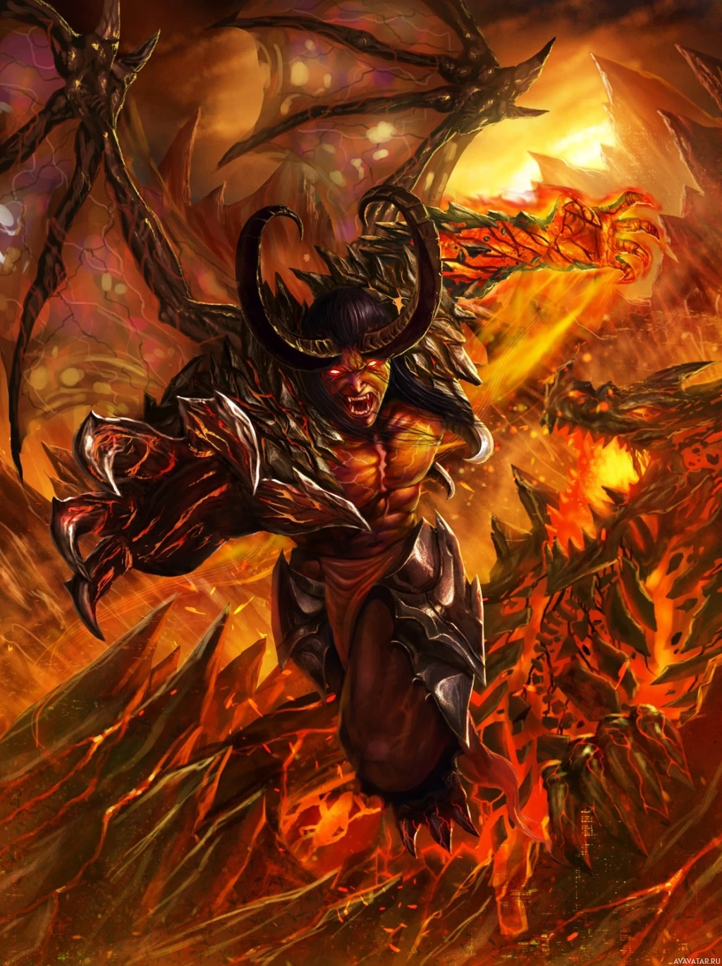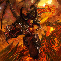 a fantasy character that appears to be a demon. The character is depicted with horns, wings, and is holding what seems to be a staff or wand. The background suggests an inferno or chaotic environment, fitting the theme of