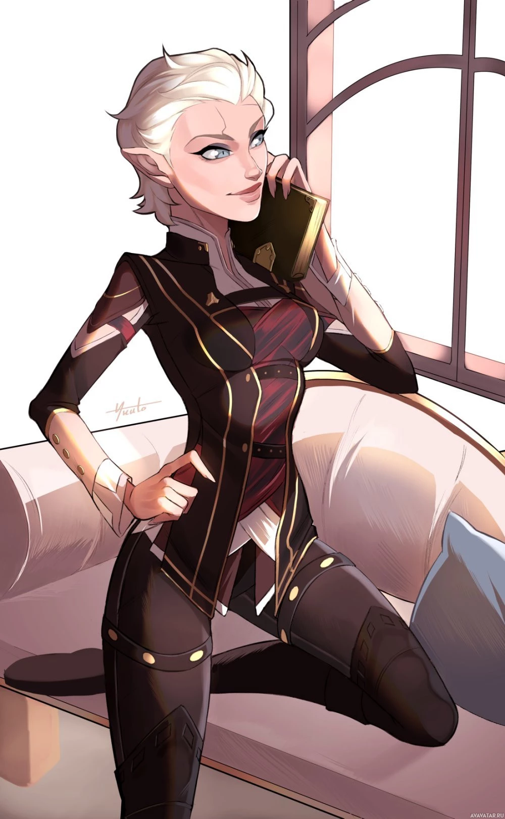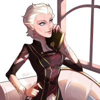 a female character depicted in an illustration style commonly associated with fantasy art. She has long