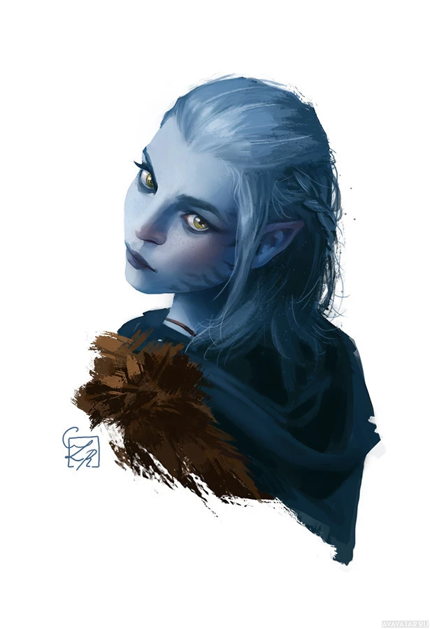 blue hair and pointed ears, which are common features associated with elves in fantasy settings. This character is depicted as