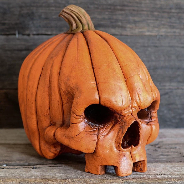 The image shows a decorative pumpkin shaped like a skull, commonly associated with