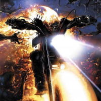 Ghost Rider riding a motorcycle. The character is wearing armor and has a fiery appearance, which is characteristic of the superhero. The background suggests an explosive or violent event, with debris and flames surrounding the scene. This style of artwork is typical for