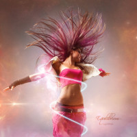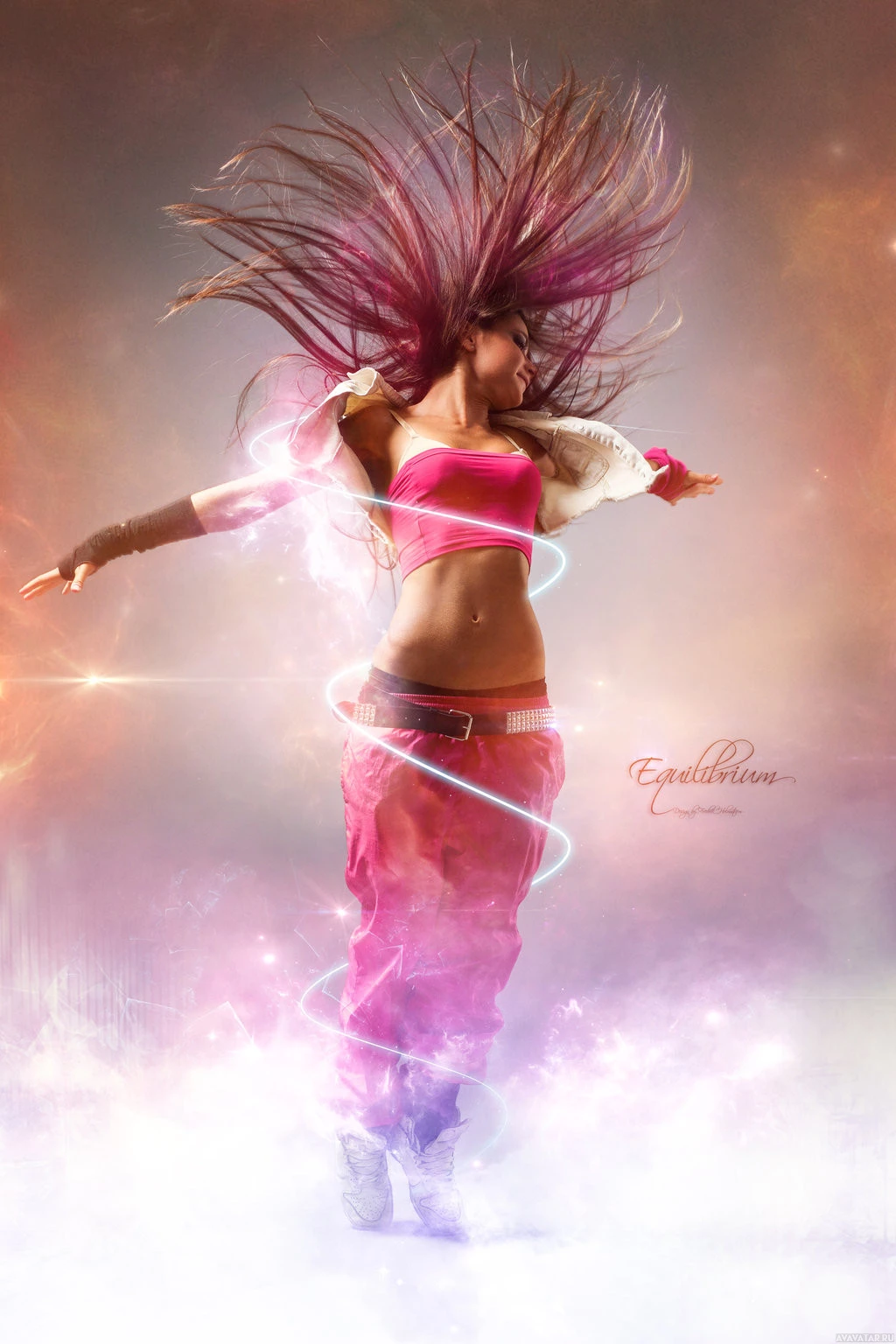 На картинке изображена молодая женщина с рыжими волосами. Она носит розовые брюки и, кажется, танцует или выступает в какой-то энергичной позе, которая создает впечатление движения. Вокруг нее есть динамические световые эффекты, предполагающие, что она может находиться в ярко освещенном пространстве или выступать под сценическими огнями. Фон, кажется, имеет градиент цветов, что способствует яркому ощущению изображения.