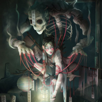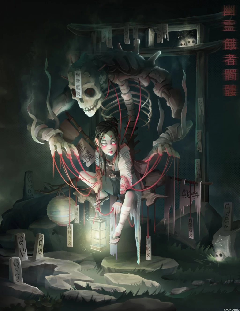 ominous figure, which could imply that she has some sort of power or protection at her disposal. The background is dark and foreboding, with silhouettes of trees and rocks that contribute to the eerie atmosphere. There are also several Chinese lanterns floating in the air around the girl, adding a mystical ambiance to the scene. These lanterns could symbolize guidance or protection against the darkness represented by the skeleton. Overall, the image conveys a sense of impending danger mixed with an air of mystery and the supernatural, which is typical for horror and fantasy genres.