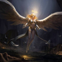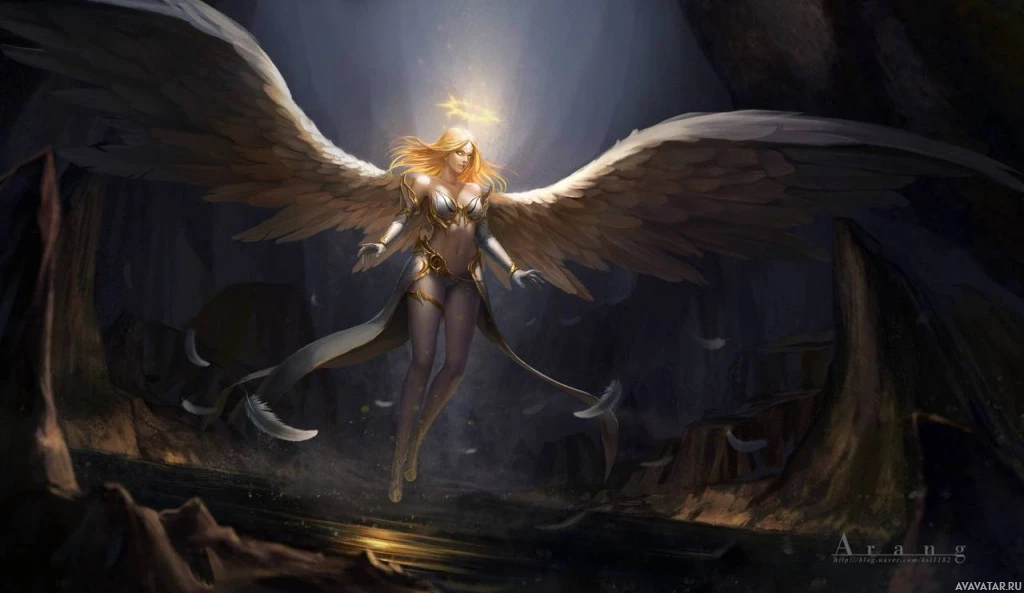 The image depicts a fantasy-themed character that appears to be an angel. It is set in a dark, ominous environment with rock formations and a small amount of light filtering through the top left corner, giving it