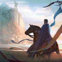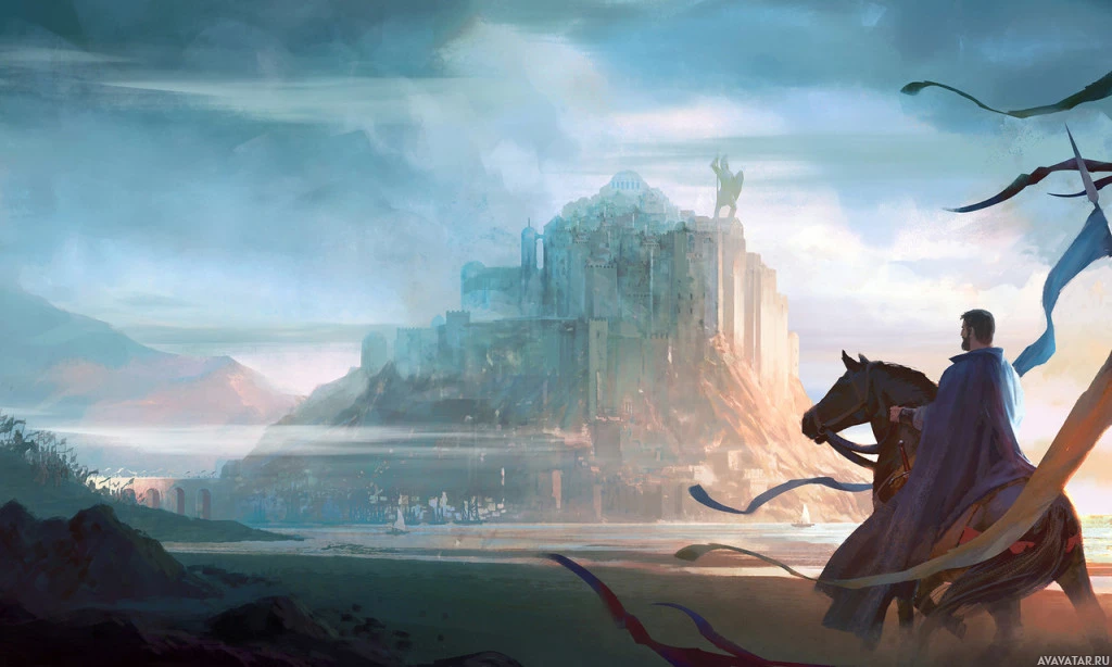 a rocky terrain with dramatic cliffs in the background, suggesting they might be approaching or leaving a castle or fortress perched atop a mountain. The setting is dusk, adding