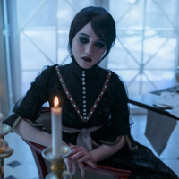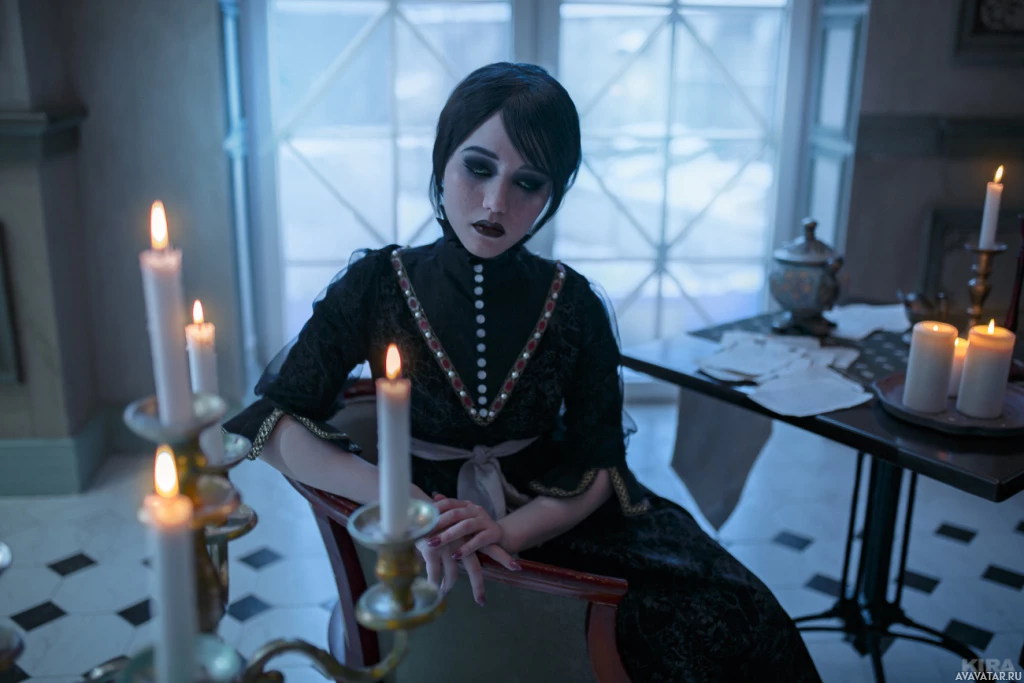 lit room with a desk and various objects that suggest a setting of importance or significance within the narrative context of the game. There are candles on the desk, and the overall ambiance is one of stillness and intensity. The character's attire, including the dress and accessories, are indicative of her status in the storyline, with a distinctive style that fans often replicate in