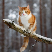 The picture shows a cat perched on a tree branch. It appears to be an orange tabby cat, and the setting looks like it could be during winter given the snowy ground and the overall cool color palette of the photo.