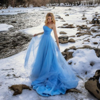 flowing dress that appears to be made from a sheer material, possibly a light fabric or tulle. Her pose and attire suggest she might be dressed for