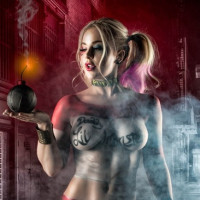 Harley Quinn features elements commonly associated with the character, such as her signature black and red outfit, a baseball bat (which she is often seen holding), and a bomb that she holds in one hand, which symbolizes her chaotic nature and destructive tendencies. The background suggests