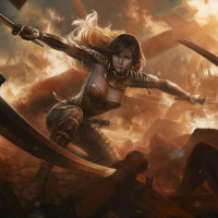 The image shows a female warrior in action pose, holding two swords. She is wearing armor and has her hair styled in such a way that it flows with the movement. There appears to be smoke or explosions around her, suggesting she might be in the midst of battle. The artwork captures a dynamic and intense moment.