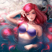 a mermaid form, wearing her signature purple and blue attire. She is sitting at the bottom of