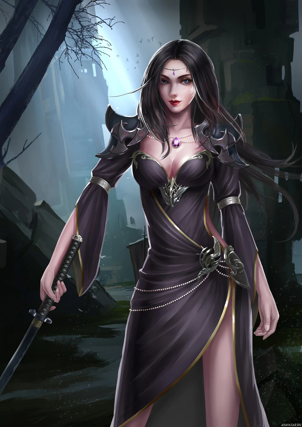 a female character, who appears to be a warrior or adventurer. She has long brown hair and is wearing armor with a gothic or dark