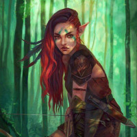 red hair, which is a common trait for elves in many fantasy narratives. She is wearing armor and holding a bow with an arrow nocked on the string, suggesting she may be preparing to hunt or defend herself in this