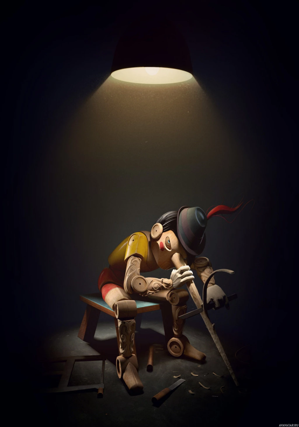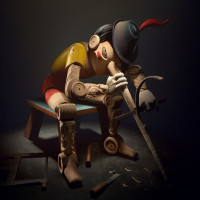 an animated character, who appears to be a robot or android, sitting alone with its head resting in its hands. The setting suggests a darkened room, possibly indicating