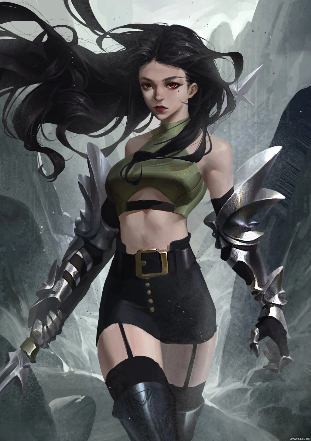 an illustrated character, a female with dark hair and red eyes. She is wearing armor and wielding a sword, suggesting that she might be a warrior or fighter in her