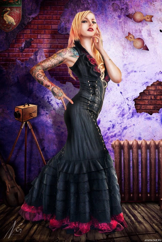 blonde hair, visible tattoos on her arms, and is wearing dark clothing with pink accents, including a corset and skirt that appear to have a vintage or steampunk design. In the background, there are