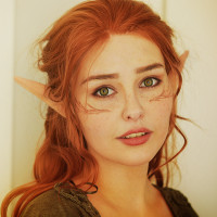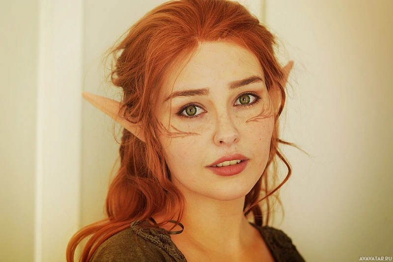 На картинке изображена молодая женщина с яркими рыжими волосами и яркими голубыми глазами. Похоже, она носит макияж, который подчеркивает ее черты. Ее выражение нейтральное, но внимательное. Фон мягко размыт, предполагая внутреннюю обстановку с естественной фильтрацией света.