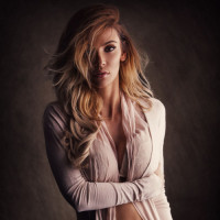 blonde hair and is wearing a pink garment that drapes elegantly over her shoulders. The background is neutral and provides