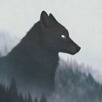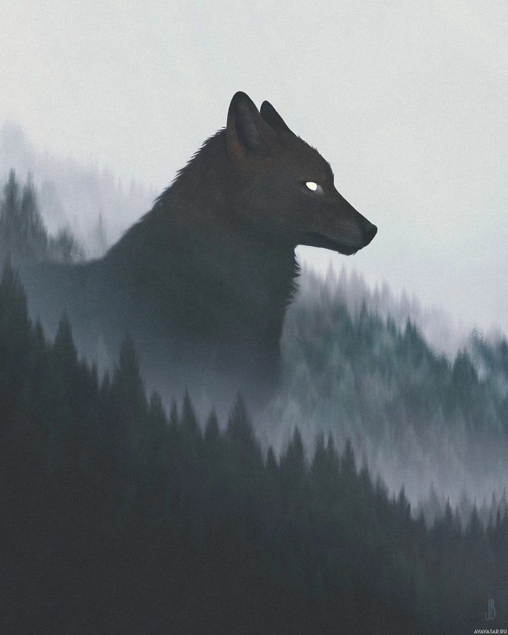 head in silhouette against a backdrop of misty or foggy mountains. The wolf is looking off into the distance with its eyes glowing, which suggests that it might be either dawn or dusk due to