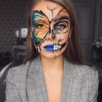 body art on their face. On one side, there is a design resembling a butterfly, while the other side of the face appears to be painted as a skull. The style of body art is reminiscent of the Día de los Muertos (Day of the Dead)