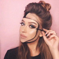 The image shows a woman posing for the camera. She has a makeup mask covering her face, which is likely a type of