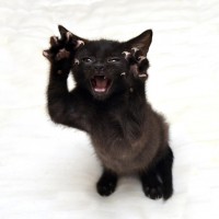 a playful manner, as if it's mimicking human behavior like waving or making gestures. The kitten looks alert and curious, possibly about its surroundings or reacting to a stimulus not visible in the image.