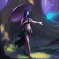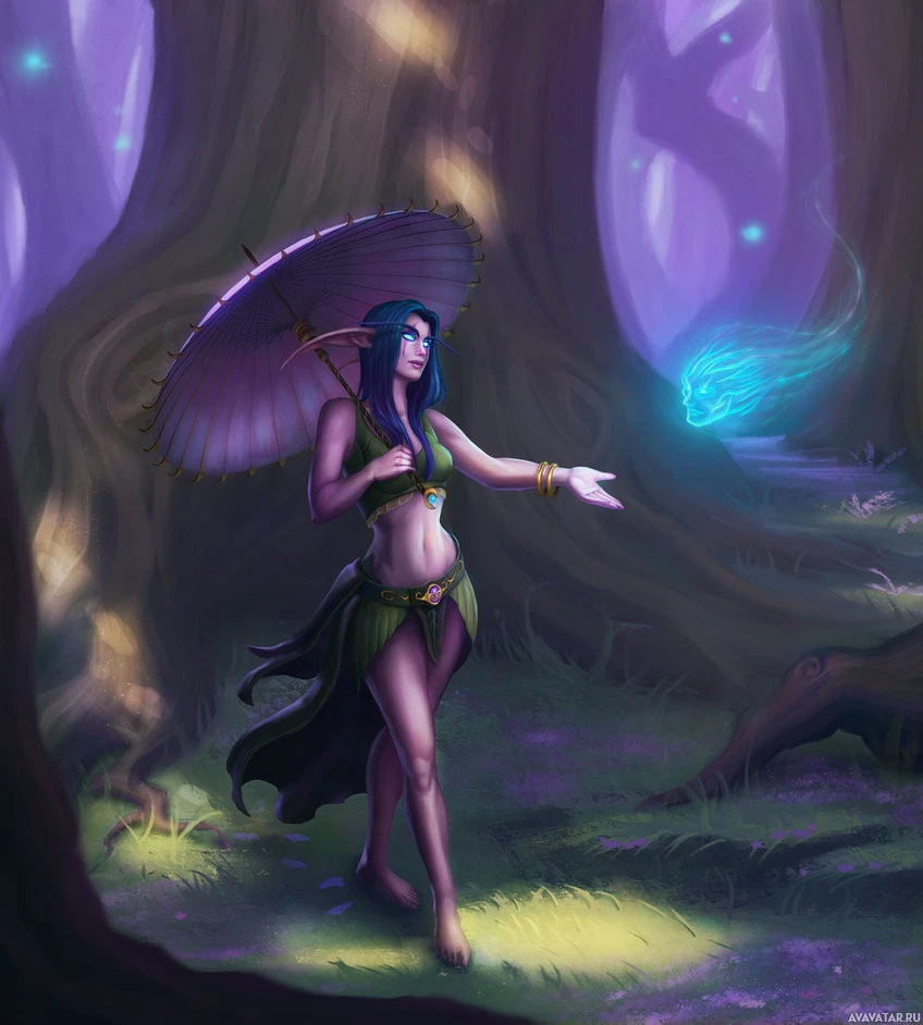 the Warcraft universe, specifically known as the Drow Priestess. She is depicted in a fantasy setting with purple and blue hues, surrounded by mossy trees that give off