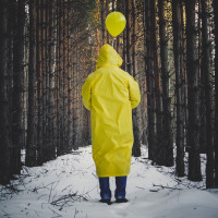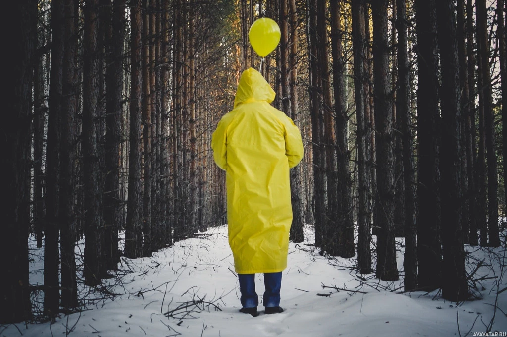 a forest setting during what appears to be winter due to the snow covering the ground. Above them, there's an orange balloon floating, which is not commonly seen in