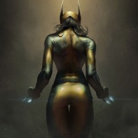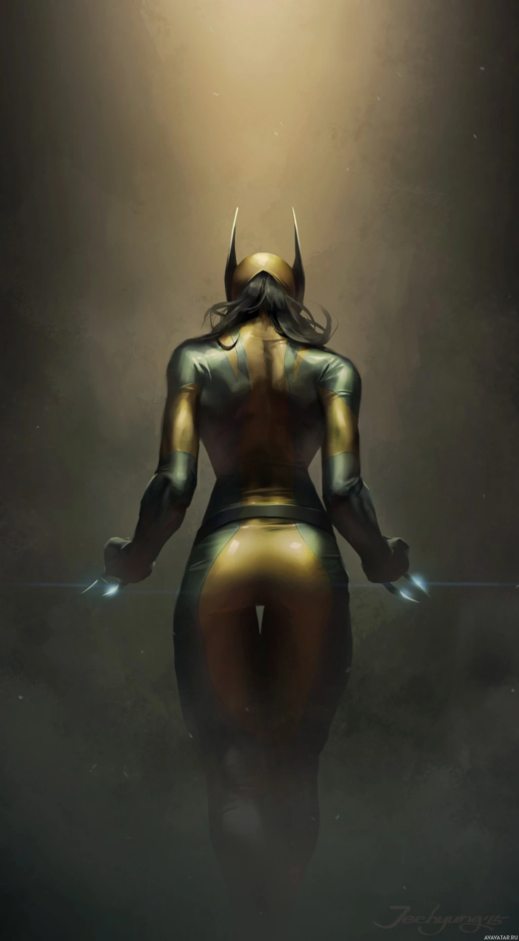 animated series. The artwork captures her profile from behind, highlighting her muscular physique which is enhanced with adamantium bones and