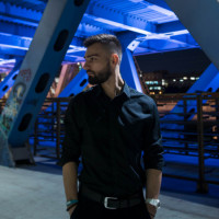 На картинке изображен мужчина, стоящий под эстакадой ночью. Он носит темную одежду и, кажется, смотрит в сторону от камеры. Есть синие огни, освещающие части сцены, которые могут указывать на то, что место находится рядом с водоемом или у тротуара на берегу реки. Структура моста и освещение придают ему ночную атмосферу.