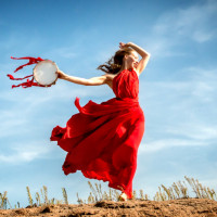 red dress, who appears to be in motion with her right arm extended as if she is holding or playing an instrument. Her left hand is raised, and the fabric of her dress is caught mid-wave due to the movement. She has
