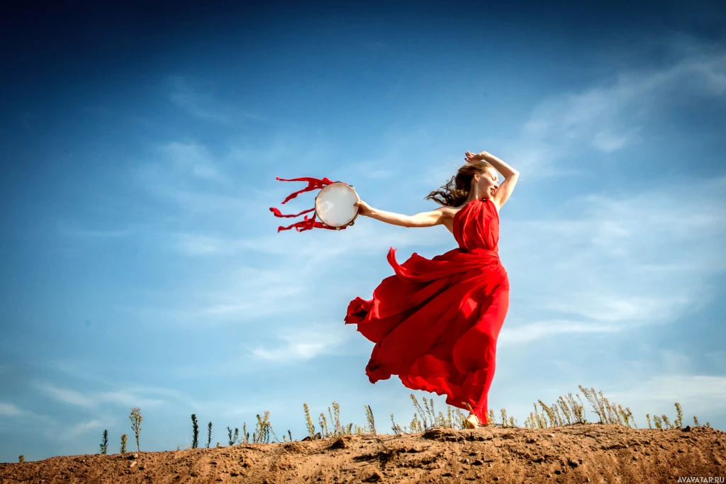 a clear sky with some clouds and what seems to be a flat landscape, possibly an open field or desert area, which contrasts with her vibrant red dress.