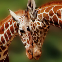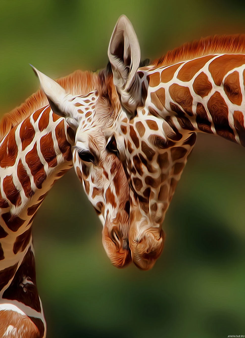 The image features two giraffes that appear to be standing close together with their necks intertwined. This behavior can be seen as a sign of affection or