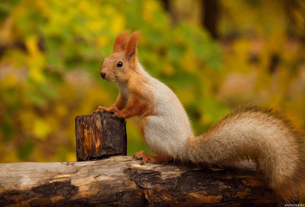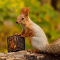 Картинка показывает белку, сидящую на том, что кажется бревном или пнем. Он расположен в наружной среде с некоторыми пожелтевшими листьями, разбросанными вокруг, предполагая, что это может быть осень. Белка имеет лапы, опирающиеся на дерево, и, кажется, наблюдает что-то перед ним.