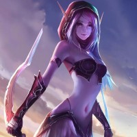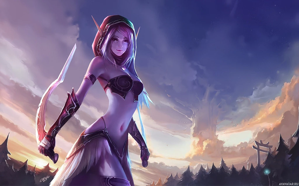 fantasy attire, featuring elements such as a hood and armor with a distinctive purple hair color that matches her outfit. Her expression is confident, and she holds a sword in her right hand. The background suggests a scene from the game's artwork, showcasing
