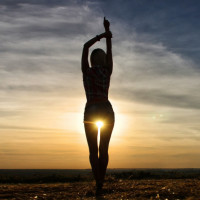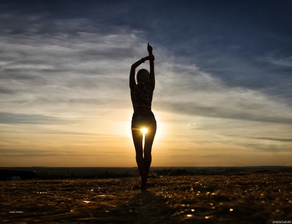the backdrop of a sunset. She appears to be in
