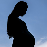 The image shows a silhouette of a pregnant woman looking down at her stomach, likely contemplating the life growing inside. It's a poignant and intimate scene that captures the anticipation and wonder associated with pregnancy.