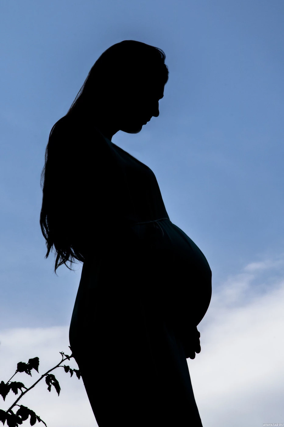На снимке изображен силуэт беременной женщины, которая смотрит на свой живот, вероятно, размышляя о жизни, растущей внутри. Это трогательная и интимная сцена, в которой запечатлены ожидание и удивление, связанные с беременностью.