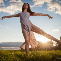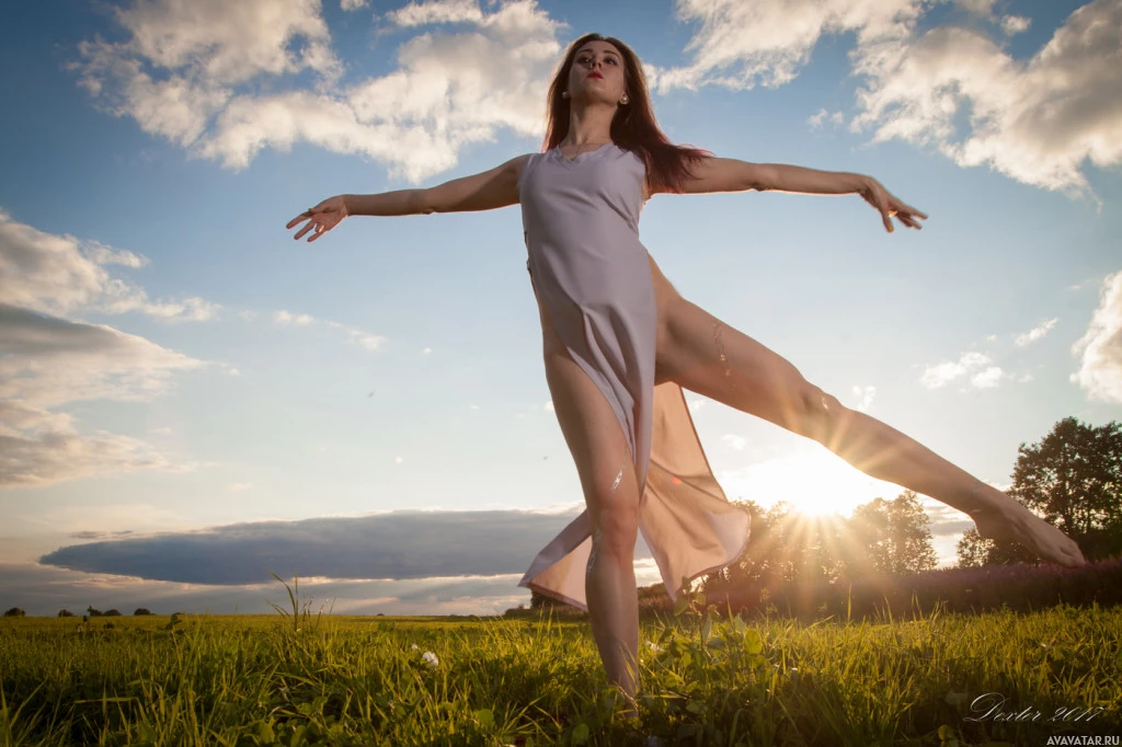 a flowing outfit that appears to be a dress or skirt. Her leg is elevated, suggesting movement. The background features